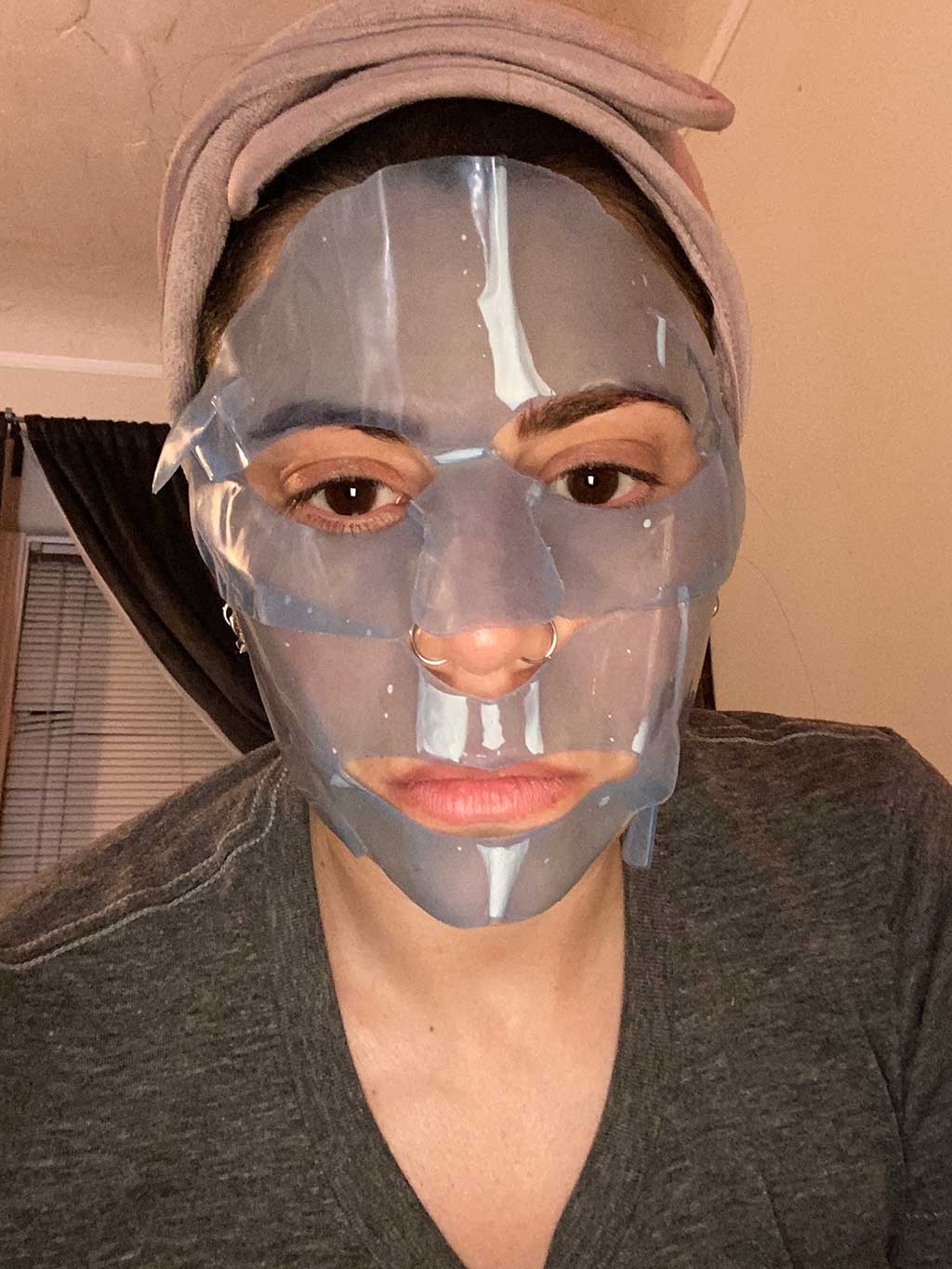 HHi, my name is Gina and I am a Licensed Esthetician and make up artist! I’ve been in the beauty industry since 2017. I have worked at Ulta and Bluemercury and I currently freelance.I have never used a mask like this before. It was a little cumbersome to use as far as the prep work. It takes a little bit of patience to do it. You have to take the clear part off first, apply the serum, leave on for five minutes and then remove the blue part and then leave on for an extra 15 minutes. But the prep work is worth the results. The results that I saw was my skin was super hydrated, the jelly mask made my skin feel very cool on my warm rosacea type skin . I feel like this mask really improved the results of the serum’s that I used my first applied the anti-aging serum and then I applied the hydrating serum on the jelly mask.