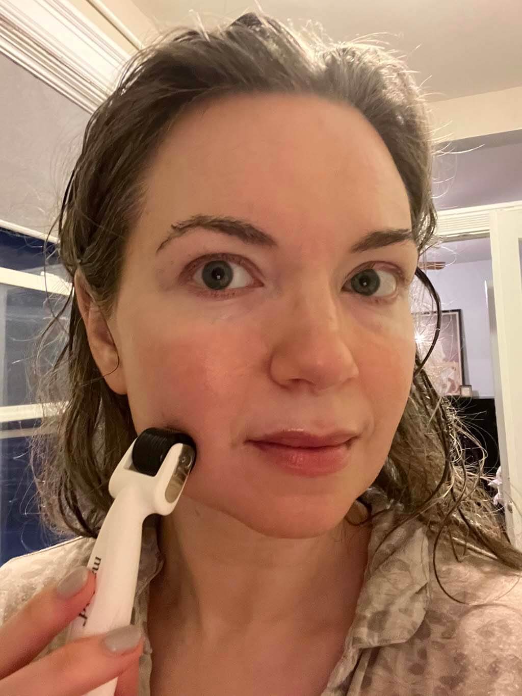 Having received medical microneedling (and having performed countless microneedling procedures when I worked for a plastic surgeon), I was both intrigued by and skeptical of the dermaroller. If it is effective enough to produce results, should it be done at home? My own experience was entirely positive. With any treatment that compromises the barrier function of the skin, sanitation is essential, so I double cleansed in the shower before using the dermaroller. The instructions said to use the roller with very light pressure until the skin turns pink. With my fair skin, I reached that point quickly with only a few passes per area. I’m curious how the company would describe the end point for a client with darker skin, which may not turn pink as visibly. It was prickly, but not unpleasant. After following the rest of the treatment protocol, including serums and mask, I was very pleased with the end result.